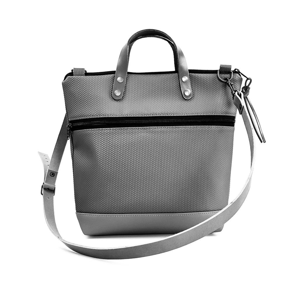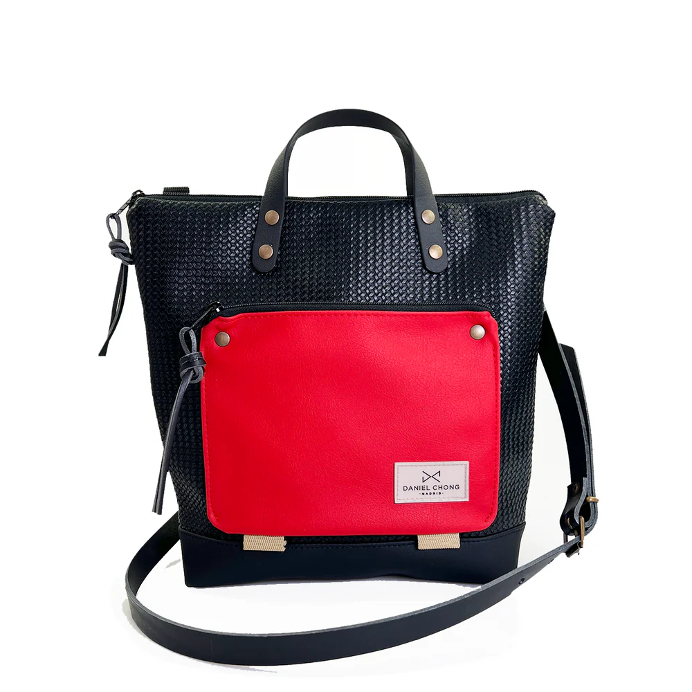 Bolso minimalista, impermeable y con el icónico bolsillo Book Holder . Ultraligera con asas y correa de piel de curtición vegetal .