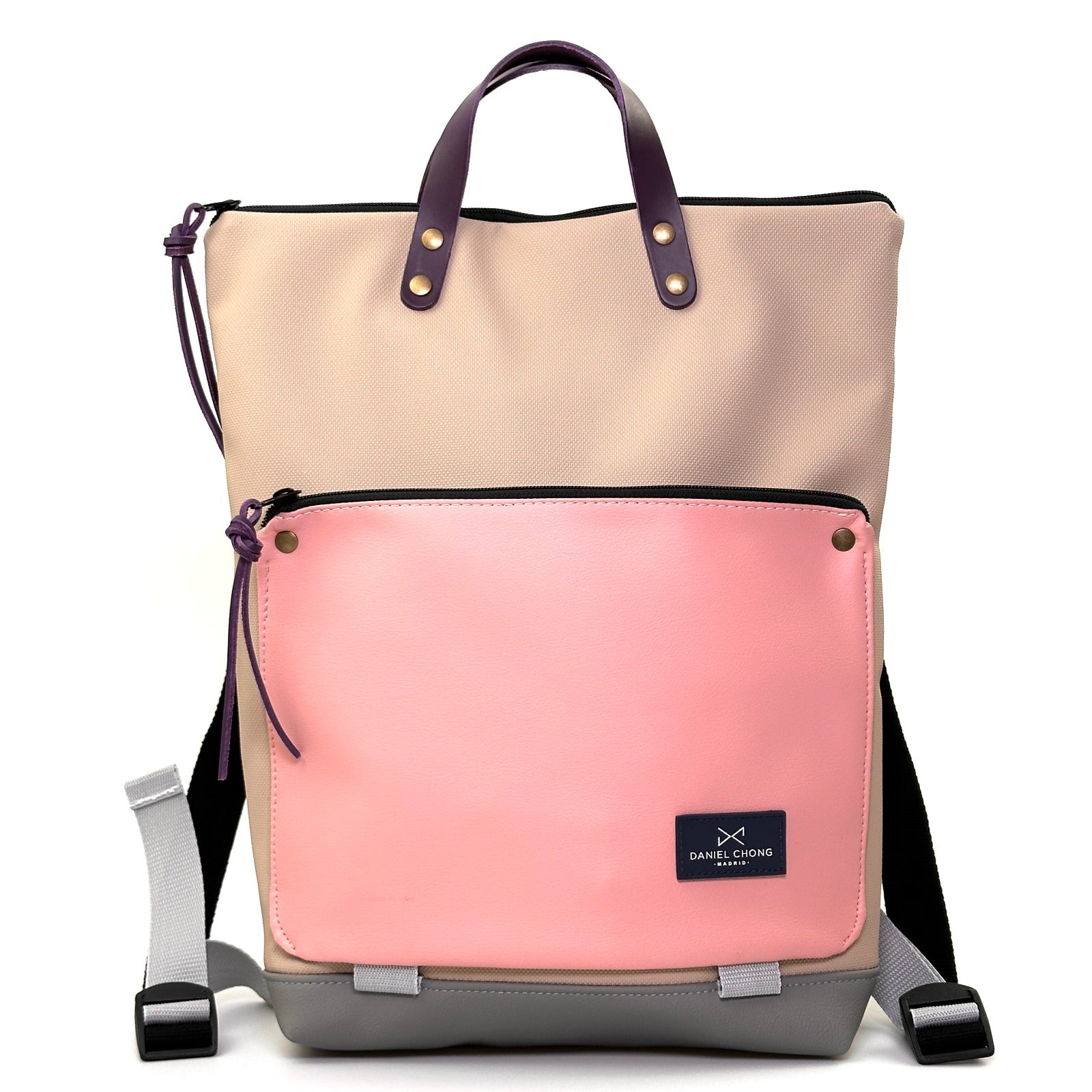Mochila unisex. Además de su forma plana, cuenta con un bolsillo exterior de piel vegana anti rozaduras con cremallera y soporte para llevar un libro o revista.